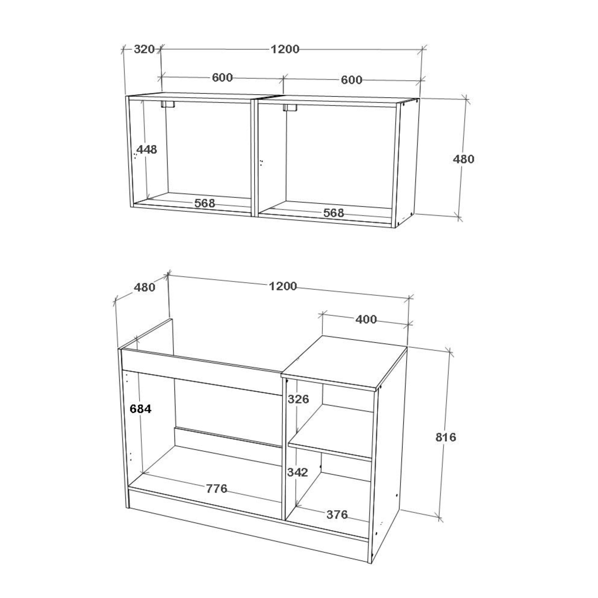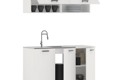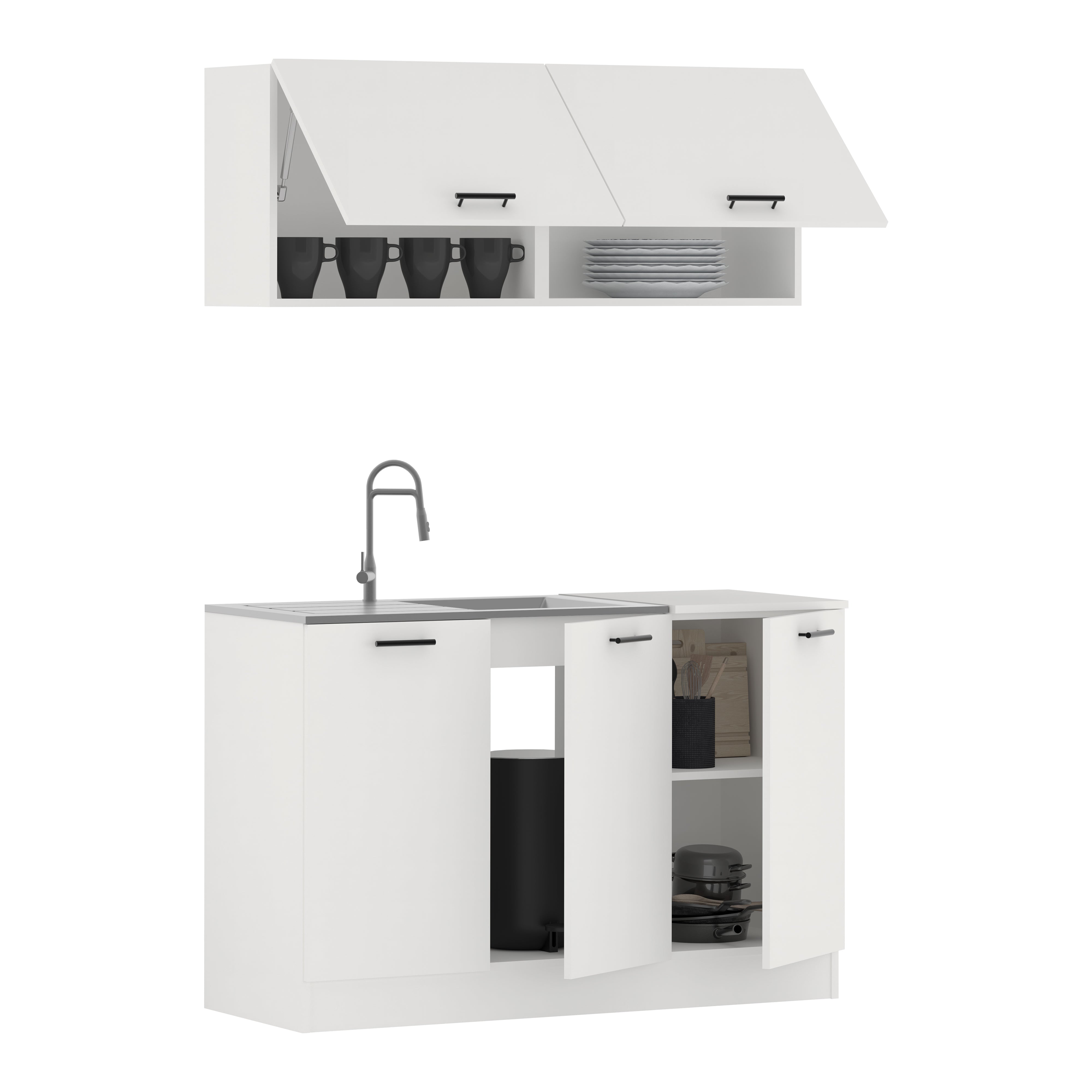 Compartimentarea este unul dintre punctele forte ale acestui set. Partea superioară este compusă din două corpuri suspendate cu uși rabatabile în sus, ideale pentru depozitarea farfuriilor, cănilor sau altor obiecte ușoare. În partea inferioară se regăsesc două componente: o mască pentru chiuvetă cu spațiu decupat și un corp lateral cu ușa, care ascunde un raft ideal pentru organizarea electrocasnicelor mici sau a ustensilelor de bucătărie.