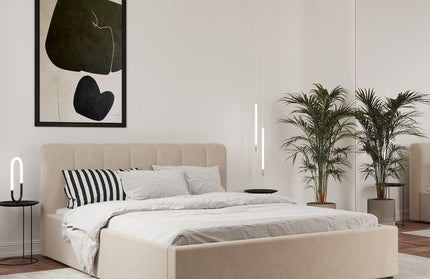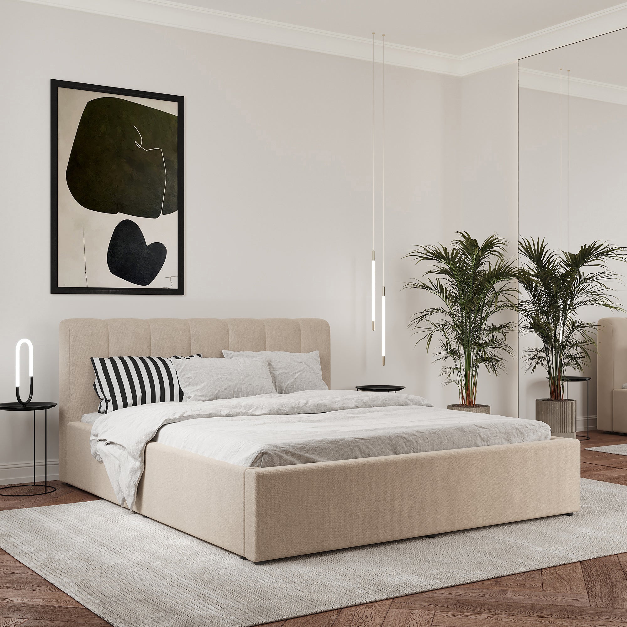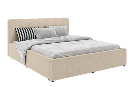 Tapițeria acestui pat este realizată dintr-un material plușat elegant, cu o textură moale și catifelată, oferind un confort deosebit. Suprafața sa are un efect subtil de umbrire, schimbându-și ușor nuanța în funcție de lumină, ceea ce adaugă profunzime și rafinament designului.